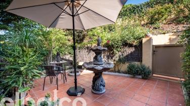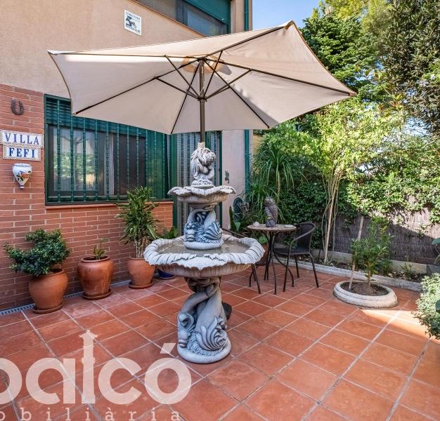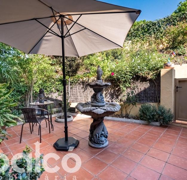 Pati zen amb font: Un espai interior serè i encantador, perfecte per crear un racó de lectura o sopars a la fresca en total intimitat.